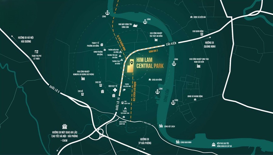 Dự án Him Lam Central Park nằm ở phía Tây Bắc của thành phố Hải Phòng. Dự án nằm tiếp giáp với Quốc Lộ 10 là tuyến đường huyết mạch của thành phố giúp thuận tiện di chuyển đến các tỉnh lân cận: Thành phố Uông Bí (Quảng Ninh), Thái Bình, Nam Định, Hưng Yên…